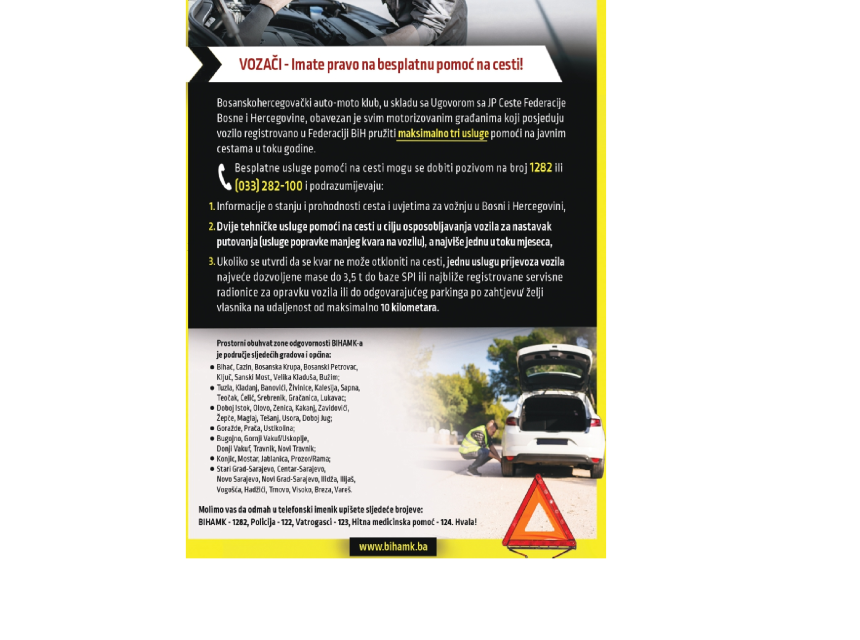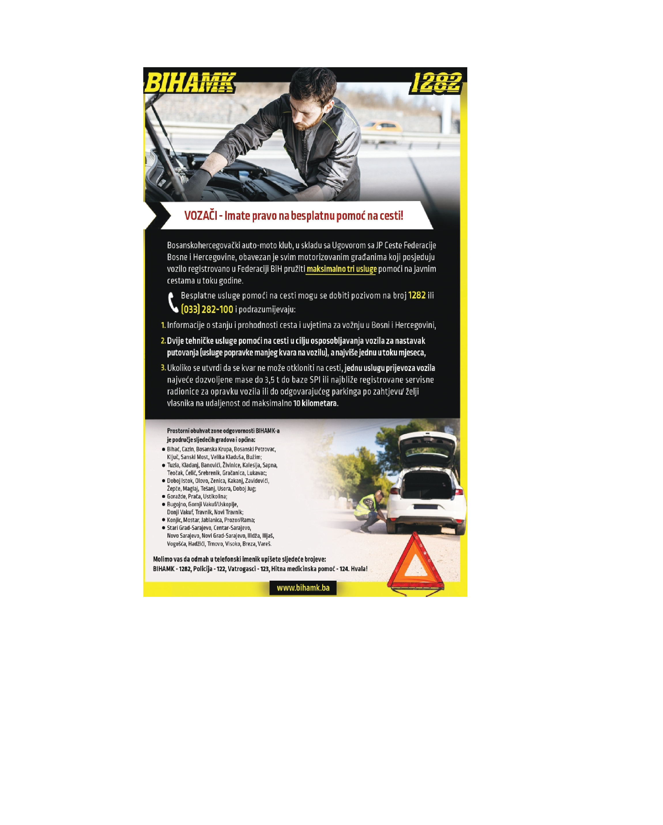 Besplatne usluge pomoći na cesti mogu se dobiti pozivom na broj 1282 ili (033) 282-100, i podrazumijevaju:
