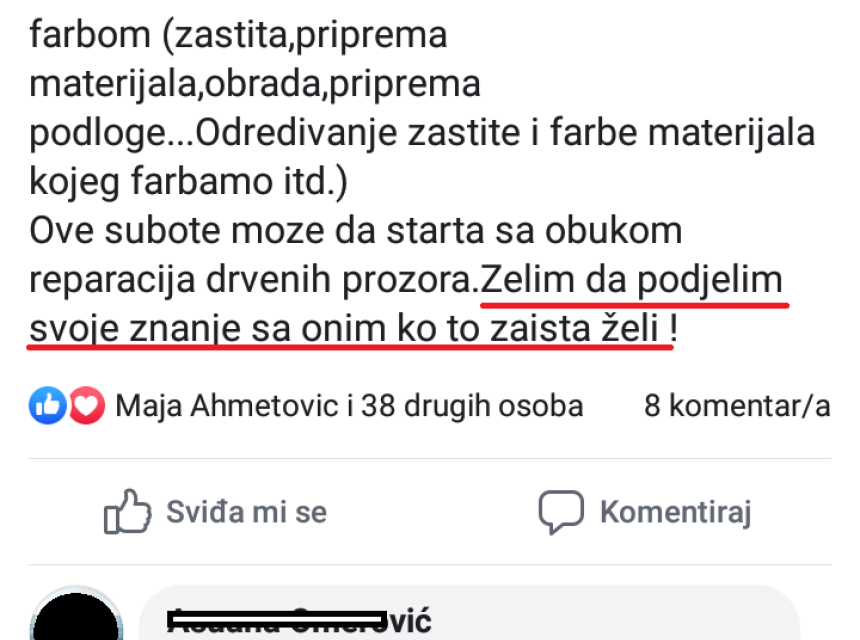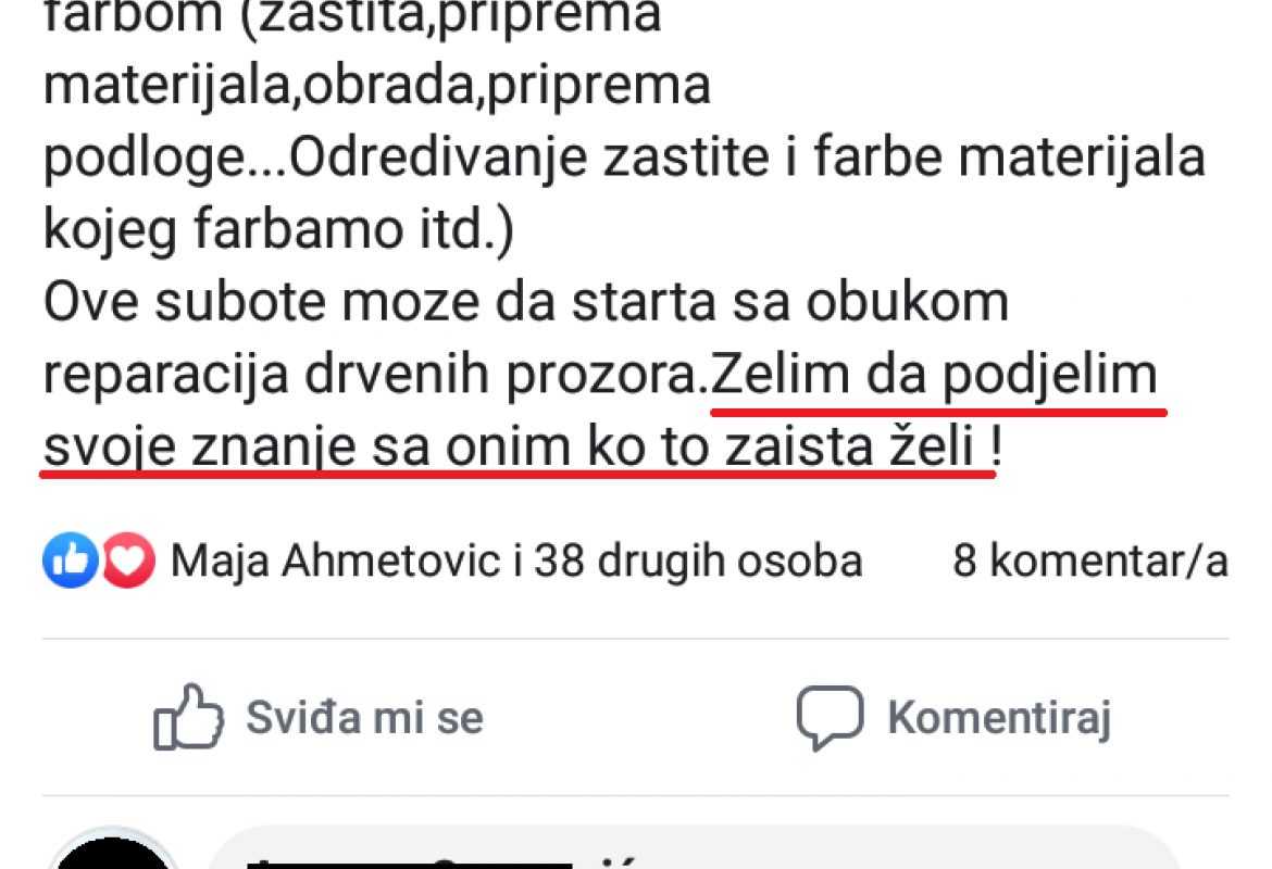 Nakon pet dana od objave na Facebook grupi koju prati preko 20 000 ljudi, jutros je zainteresiranu sugrađanku zanimalo da li se iko javio na poziv sa željom da nauči osnove moleraja. Kao što je i vidljivo, majstor koji je postavio status i koji nudi edukaciju, uz nevjericu je odgovorio kako se niko nije javio na oglas.