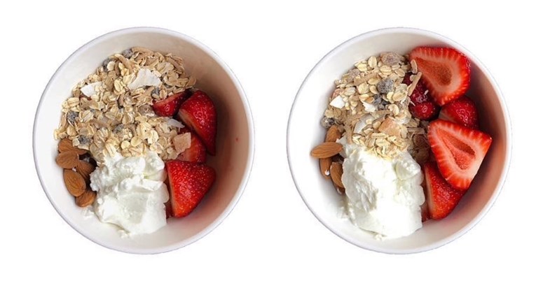 Na prvi pogled su zdjelice potpuno jednake, ali zapravo se u lijevoj nalazi 214 kalorija više nego u desnoj (580:366). Također, lijeva sadrži 4 grama proteina manje od desne (19:23)