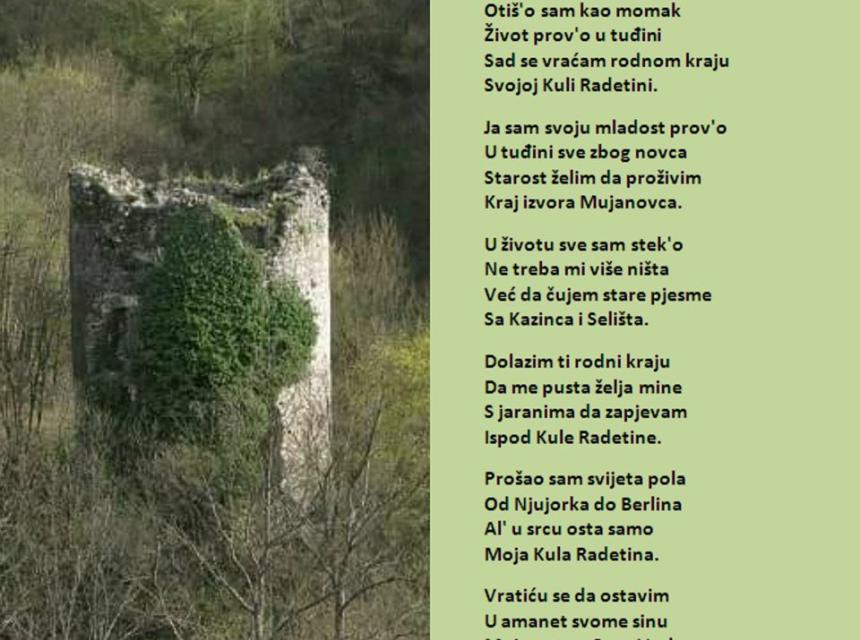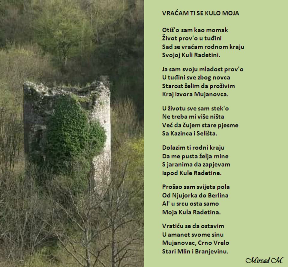 „Prošetah pored Kule Radetine, prisjetih se svoga djetinjstva i drugova koji su kao momci otišli iz rodnog kraja u bijeli svijet. Njima u spomen napisah ove stihove u nadi da će se jednog dana vratiti i završiti svoju životnu priču tamo gdje su je započeli.” – napisao je Mirsad.