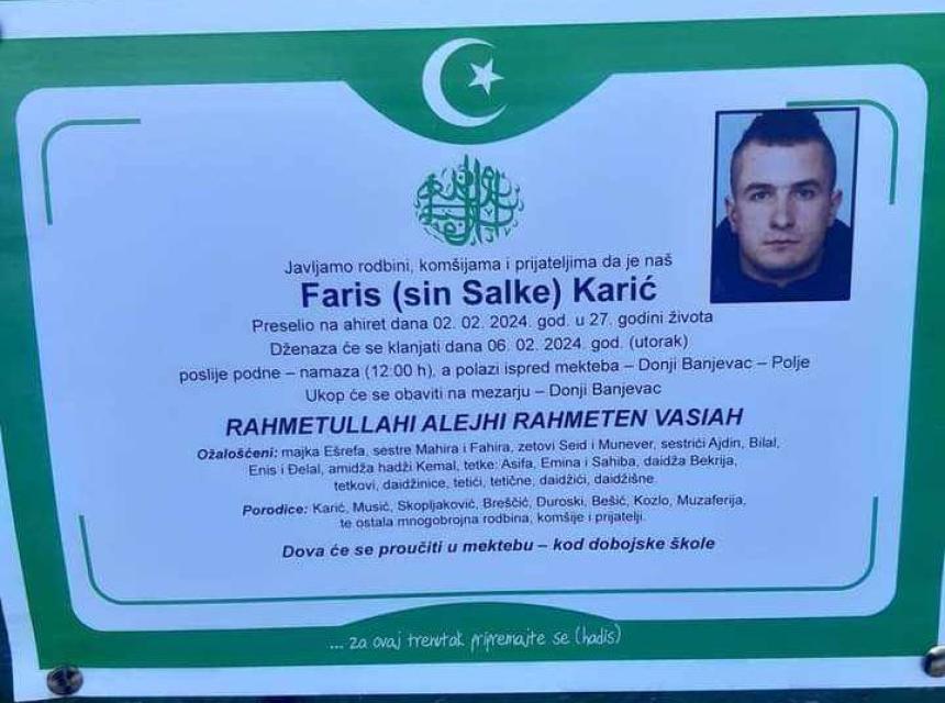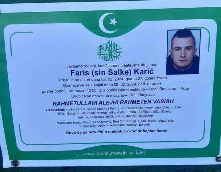 Dženaza mladiću Farisu Kariću (27), koji je poginuo u sudaru s vozom kod Kaknja, klanjat će se danas poslije podne-namaza, a polazi ispred mekteba Donji Banjevac - Polje.