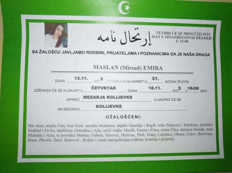 Podsjećamo, Bećirović je u ponedjeljak usmrtio Emiru, bišvu partnericu, u njenom stanu koji se nalazi na Alipašinom Polju. Tijelo su pronašli policijsku službenici nakon dojave poslodavca i porodice jer se Emira nije pojavila na poslu niti javljala na telefon.
