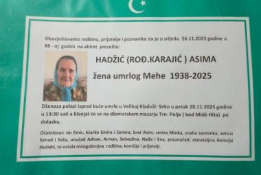 Na Ahiret preselila Hadžić (rođ. Karajić) Asima