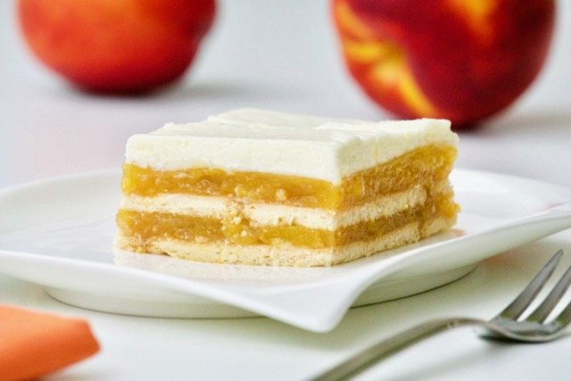 U lim za pečenje premazan maslacem složite na dno red keksa, odmah ih prelijte polovicom vruće kreme sa breskvama, zatim složite preko kreme drugi red keksa i opet preko njih izlijte ostatak kreme. Poravnajte i ostavite da se kolač ohladi.