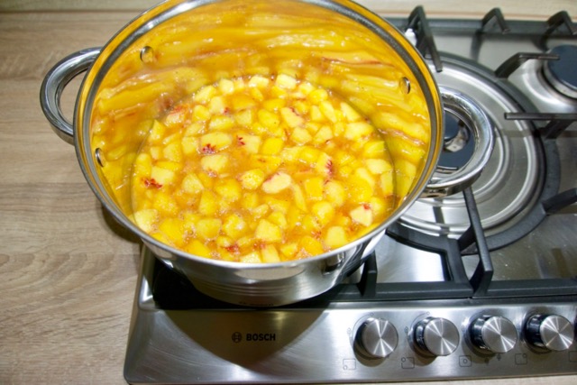 U raskuhane breskve dodajte puding razmućen za preostalih 100 vode i dobro promiješajte. Kuhajte 4-5 minuta dok se krema ne zgusne.