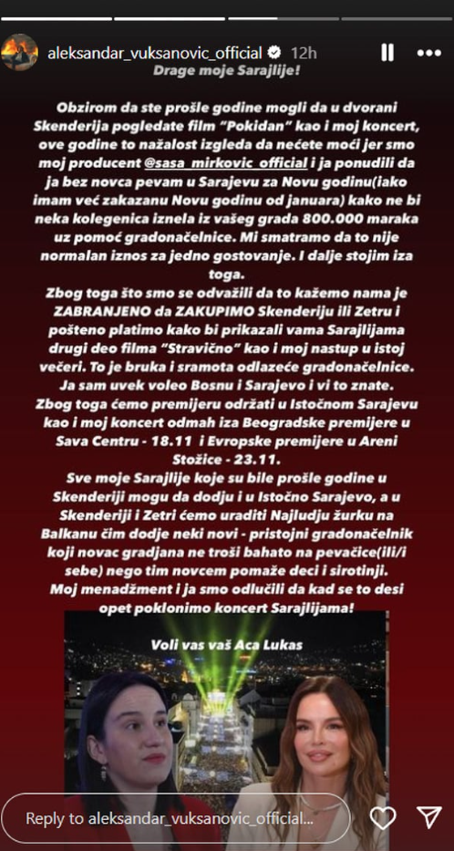 "S obzirom da ste prošle godine mogli da u dvorani Skenderija pogledate film 'Pokidan' kao i moj koncert, ove godine to nažalost nećete moći jer smo moj producent Saša Mirković i ja ponudili da bez novca pjevam u Sarajevu za Novu Godinu (iako imam već zakazanu Novu godinu od januara) kako neka koleginica ne bi iznijela iz vašeg grada 800.000 maraka uz pomoć gradonačelnice. Mi smatramo da to nije normalan iznos za jedno gostovanje i dalje stojim iza toga", napisao je na početku objave.