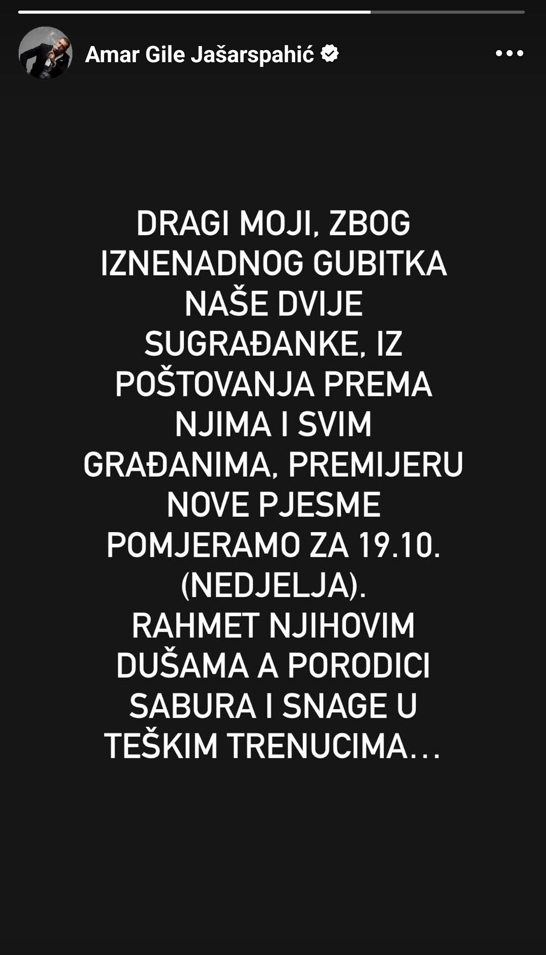 -Dragi moji, zbog iznenadnog gubitka naše dvije sugrađanke, iz poštovanja prema njima i svim građanima, premijeru nove pjesme pomjeramo za 19.10. (nedjelja). Rahmet njihovim dušama, a porodici sabura i snage u teškim trenucima.