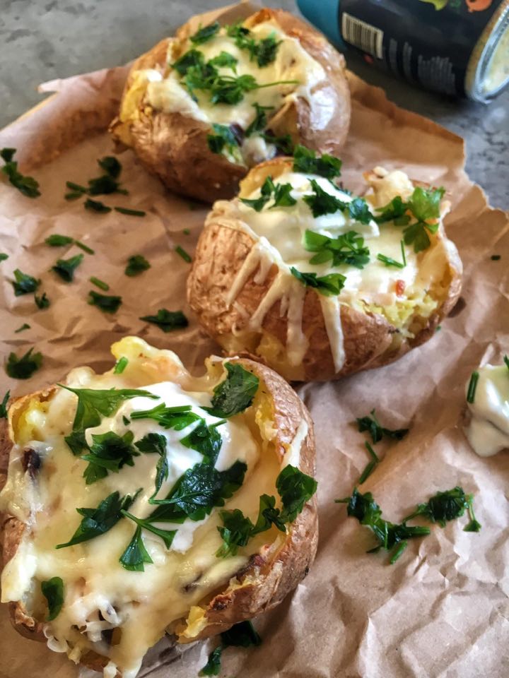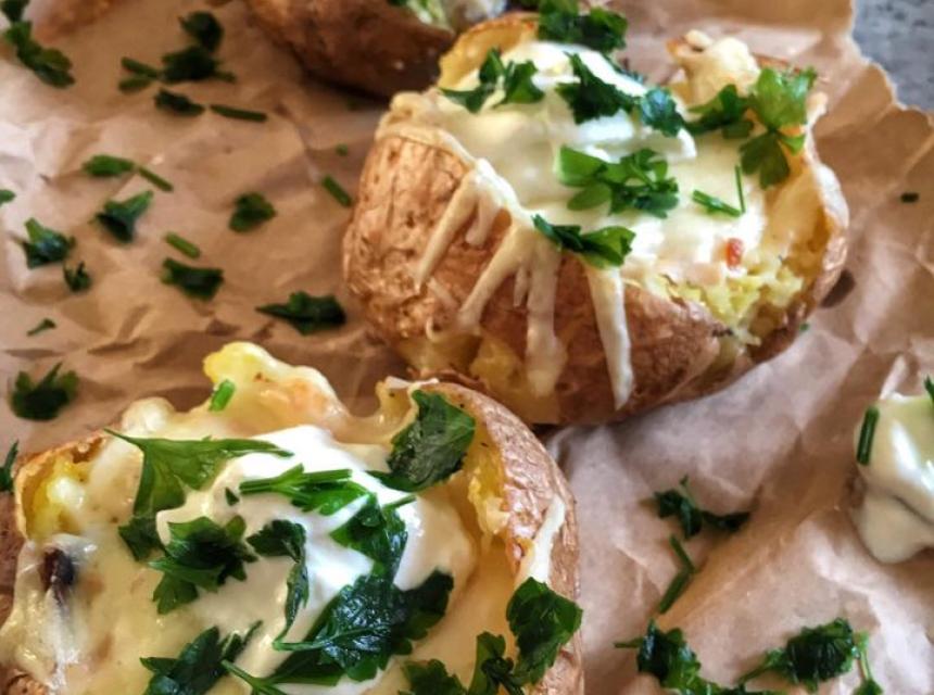 Kada se ispeku prerežite ih po sredini sa velikim nožem i otvorite te stavite u svaki komadić putera i Vegete,mješajte malo i napravite prostora za punjenje.Ja sam punila sa naredanom pilećom šunkom,trapist sirom,vrhnjem za kuhanje i suhim mesom,dobro izmješajte sve i punite krompire.Na kraju još sira i stavite da vam se još zapeče nekih 20-ak minuta.Služite toplo sa svježim peršunom te malo vrhnja ili pavlake. Prijatno 🤗.