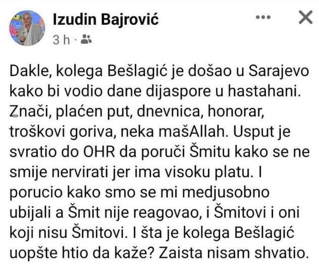 Taj video komentirao je i Izudin Bajrović, iznoseći kritiku zbog onoga šta je Bešlagić rekao, ali i sa osvrtom na rad svog kolege.