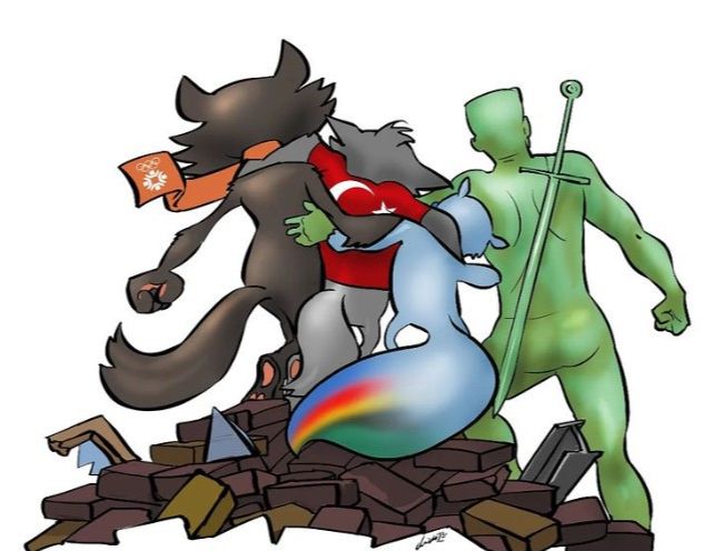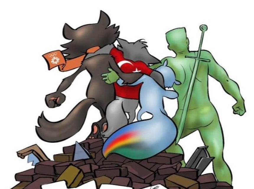 Na ilustraciji se nalaze Vučko, predstavnik Sarajeva, Zagi, predstavnik Zagreba i predstavnik Beograda Pobednik kako pridržavaju povrijeđenog vuka koji na sebi ima obilježja turske zastave.