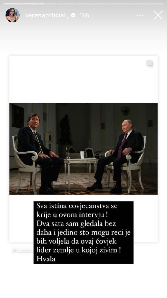 Jedna od njih je i bh. pjevačica iz Trebinja Verena Cerovina, koja je na svom Instagram profilu objavila sliku intervjua Putina sa američkim konzervativnim novinarom Carlsonom. Cerovina je navela da bi voljela da Putin bude, ni manje ni više, nego lider zemlje u kojoj živi.