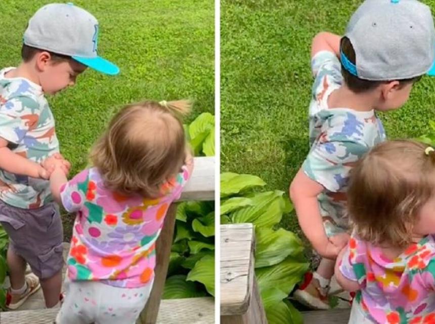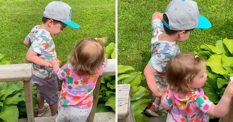 Dječak je bio vrlo oprezan dok je pomagao sestri. Držao ju je za ruku i govorio joj slatke rečenice poput "U redu si" i "Bravo, dušo". Međutim, problem se dogodio na posljednjoj stepenici koja je bila previsoka za djevojčicu, a spletom okolnosti slatki brat i sestra nisu uspjeli održati ravnotežu i pali su u biljke do stepenica, ali ni jedno od djece nije se ozlijedilo.