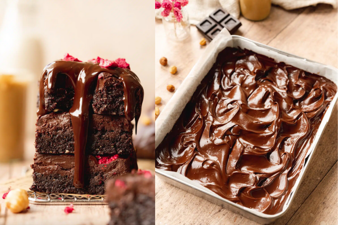 Nanesite glazuru (čokoladni ganache ili nutella) na kolač u ravnomjernom sloju koristeći lopaticu. Pospite kolač prženim lješnjacima i malinama ili jagodama. Kolač vrati u frižider na još sat vremena da se ganache stegne, a zatim narežite na pojedinačne kocke.