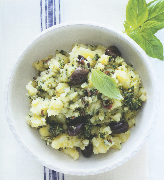 PRIPREMA: Listove bosiljka očistiti vlažnom krpom i izmiksati s pinjolima i bijelim lukom, posoliti i dodati ulje i papriku. Krompir oguliti, oprati, izrezati na kockice i kuhati na pari 10-12 minuta, prebaciti u zdjelu i odmah lagano izgnječiti viljuškom. Dodati izmiksanu smjesu i masline, pažljivo promiješati i poslužiti. Salata je ukusna i hladna i topla.