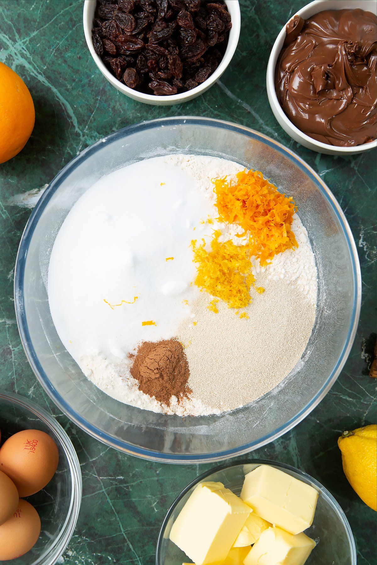 Kvasac pustiti da se kratko digne u malo mlijeka pa mu dodati cca 7 dkg brašna, promiješati pa ostaviti tu smjesu cca 30 minuta da se digne. U posudu staviti ostatak brašna, prstohvat soli, šećer, rastopljeni maslac, naribanu koricu narandže i žumanjke. Dodati smjesu s kvascem pa od svega napraviti mekano tijesto. Ako treba dodati još mlijeka da dobijete mekano tijesto.