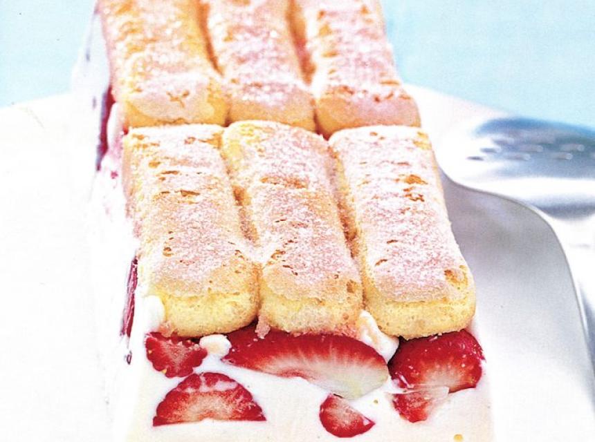 Priprema: Jagode oprati, prepoloviti, posuti s dvije kašike šećera i limunovim sokom. Pomiješati mascarpone, šećer u prahu i vanilin šećer, te ručno mutiti oko 5 minuta. Želatin rastopiti u hladnoj vodi, iscijediti, kratko kuhati s mlijekom na laganoj vatri te dodati umućeni mascarpone. Sok koji su pustile jagode pomiješati s rumom te umakati piškote samo s jedne strane i slagati ih u kalup (suhom stranom prema zidu kalupa), prekriven prozirnom folijom. Usuti jagode, mascarpone i držati u frižideru najmanje tri sata. Pažljivo istresti na veći tanjir, ukloniti foliju, izrezati i poslužiti.