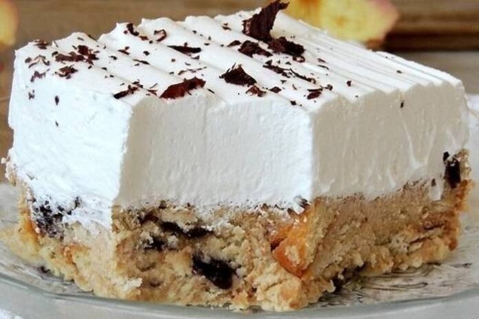 PRIPREMA: Nasjeckajte kekse na veće komade. U posebnoj posudi pomiješajte jogurt (može i voćni), pavlaku, šećer i vanilin šećer, pa dodajte nalomljene kekse. Sve dobro promiješajte. Oblikujte po želji. Stavite u frižider da se dobro ohladi i da keks upije tekućinu. Umutite vrhnje za šlag, pa ukrasite kolač šlagom i dobro ohladite.
