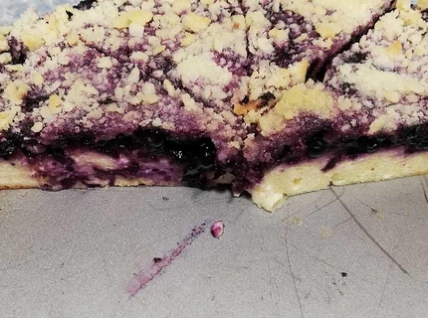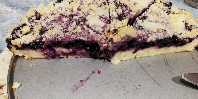 Borovnice staviti na tijesto. Od čaše brašna, šećera u prahu i maslaca napraviti smijesu za sipanje. Smjesu staviti na borovnice