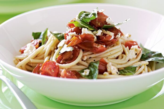 POTREBNO: tjestenina po izboru, 2 paprike, 1 konzerva pelata , 2 česna bijelog luka, komad feta sira, maslinovo ulje, so, biber, bosiljak