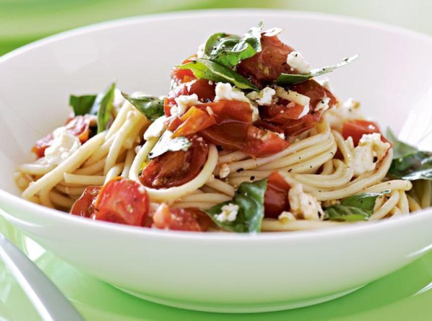 PRIPREMA: Na malo maslinovog ulja na laganoj vatri propržite sitno nasjeckani bijeli luk dok ne zamiriši. Dodajte papriku izrezanu na kockice. Kad paprika malo omekša dodajte usitnjene pelate, posolite, pobiberite i dodajte bosiljak. Krčkajte na laganoj vatri oko 10 minuta. Ugasite vartru te dodajte feta sir koji ste usitnili. Prelijte po tjestenini i uživajte u laganom ručku.