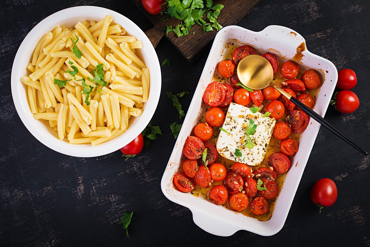 Operite paradajz i stavite ga u posudu za pečenje, zalijte maslinovim uljem, posolite i pobiberite. Na sredinu stavite feta sir u jednom komadu i još malo polijte maslinovim uljem. Stavite u rernu zagrijanu na 180 Celzijevih stepeni i pecite 30 minuta. Za to vrijeme skuhajte tjesteninu u slanoj vodi. Kada su paradajz i sir pečeni, izvadite ih iz rerne, dodajte sitno nasjeckani bijeli luk i bosiljak pa sve skupa promiješajte. Dodajte u posudu za pečenje skuhanu tjesteninu, još malo promiješajte da se svi sastojci sjedine, a potom poslužite.