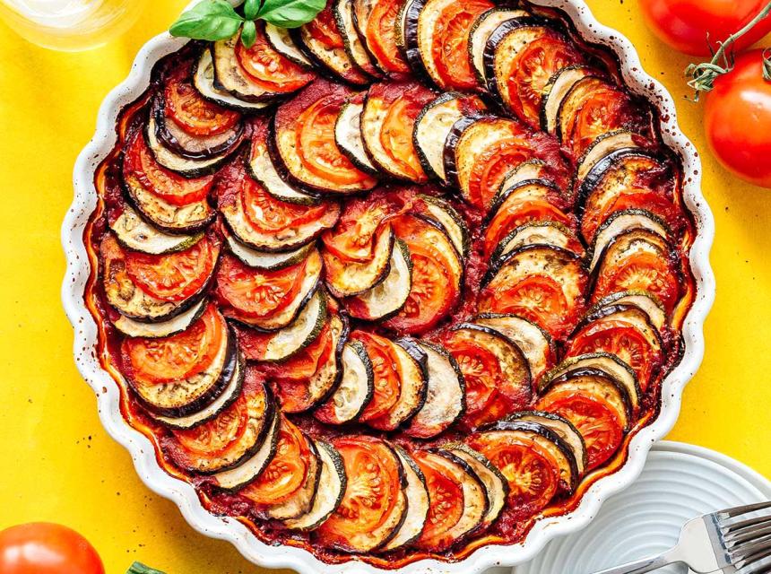 Narežite povrće na kockice te začinite solju i biberom. Pržite patlidžane pet minuta u tavi. Potom stavite povrće u veliki namašćeni kalup za složenac. Zatim stavite u lonac pasirani pradajz, so, biber, začinsko bilje, povrtni temeljac, ulje i koncentrat paradajza te zakuhajte umak. Prelijte povrće umakom te stavite sve u rernu na 200 Celzijevih stepeni (rerna s ventilatorom). Uživajte u jelu, a možete ga poslužiti i s hljebom ili rižom.