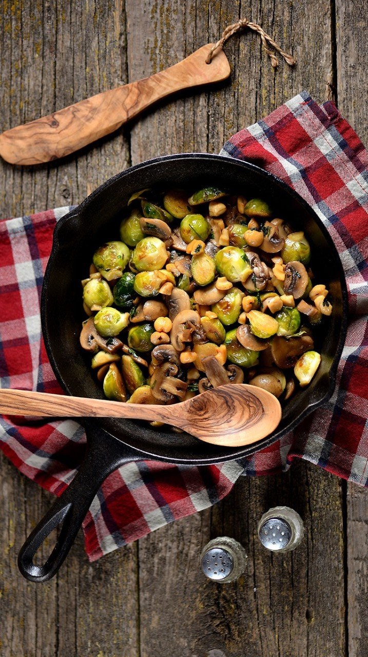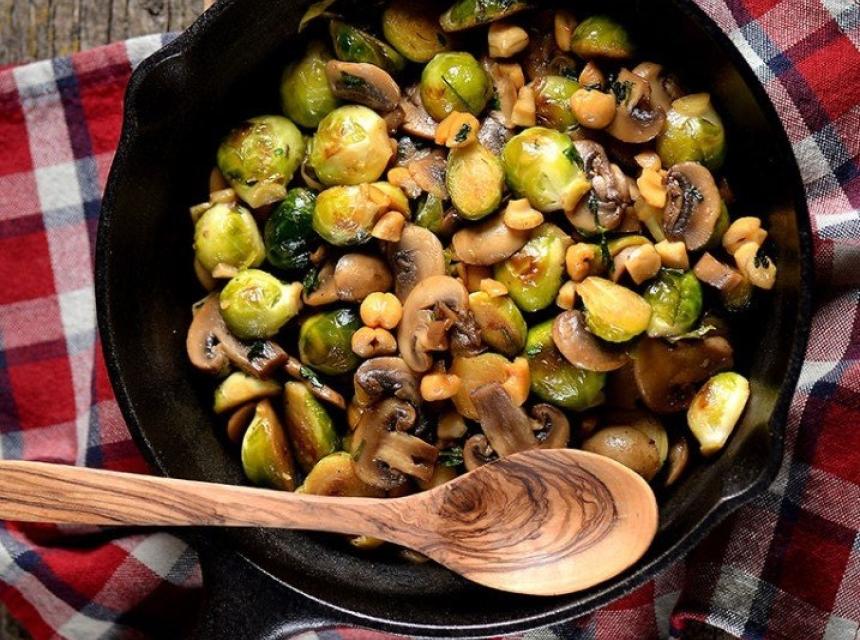 Prokulice očistite, operite i posušite. Šampinjone očistite i narežite na manje komade. U tavi tostirajte lješnjake dok ne dobiju lijepu boju, maknite ih na tanjir, a u istoj tavi zagrijte maslinovo ulje, dodajte sitno nasjeckani luk i pržite dvije minute. Dodajte prokulice i pržite uz povremeno miješanje oko pet minuta, dodajte malo vode pa nastavite pirjati još pet minuta. Potom dodajte pripremljene šampinjone i protisnuti bijeli luk pa pirjajte sve skupa još deset minuta. Posolite, pobiberite i prije posluživanja dodajte tostirane lješnjake i nasjeckani peršunov list. Kako bi se prokulice bolje termički obradile, svaku u korijenu, gdje su najtvrđe, nožem lagano zarežite u križić.