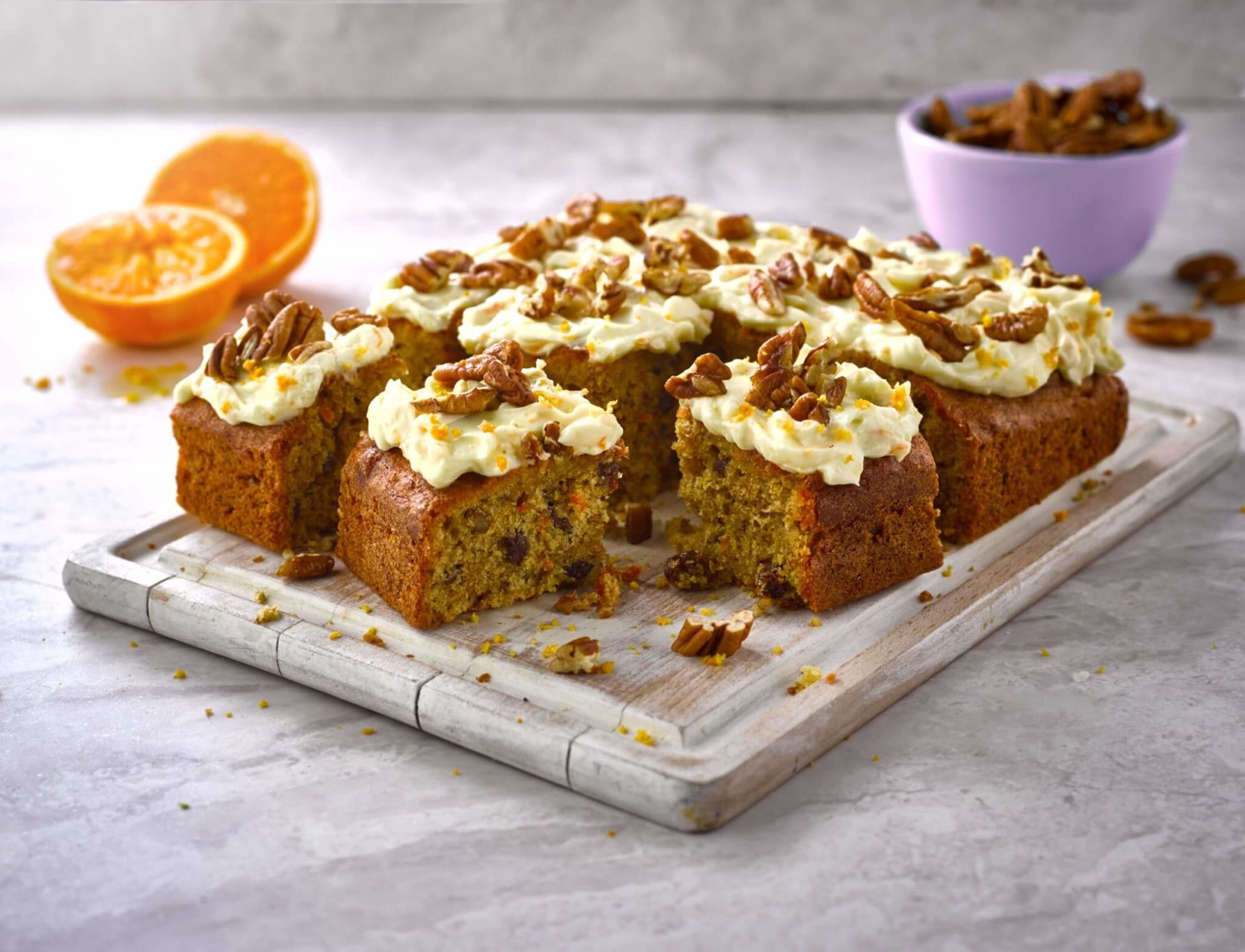 Izmutite sve sastojke u smjesu za biskvit: cijela jaja, šećer i ulje posebno, suhe sastojke posebno, zatim ih sjedinite i na kraju lagano umiješajte naribanu mrkvu. Pecite u namašćenom kalupu za torte na 170 Celzijevih stepeni 40-50 minuta. Provjerite čačkalicom je li pečen. Ispečeni i ohlađeni biskvit prerežite popola. Prelijte ga iscijeđenim sokom jedne narandže. Izmutite kremu od krem sira, omekšalog putera, šećera u prahu i narandžine korice. Premažite prvu polovicu biskvita s pola kreme, zatim poklopite drugim biskvitom i premažite preko ostatak kreme. Ukrasite prema želji – sjeckanim orasima ili tostiranim lješnjacima.