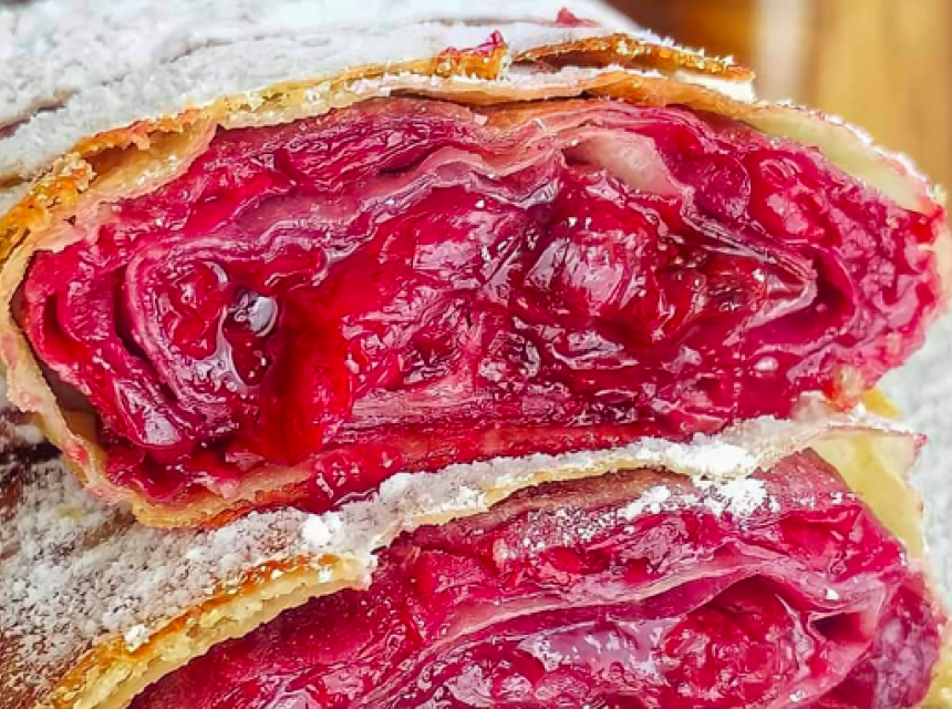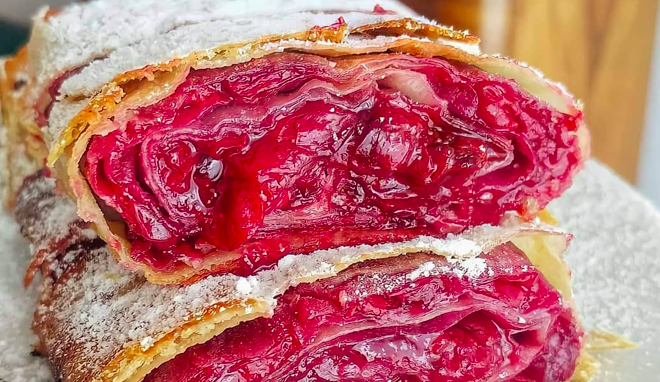 Prvo pripremite fil. Jaja i šećer pjenasto umutite mikserom. Dodajte griz pomješan sa praškom za pecivo, ulje i jogurt. Sve zajedno umutite još malo dok se ne povežu sastojci. Višnje operite, očistite i ocjedite. Kore razdvojite i podjelite na 6 djelova po 3 kore. Ostale kore, ako vam preostanu u pakovanju, odložite ili iskoristite za nešto drugo. Ovde vam je potrebno samo 18 kora za 6 finih i tankih rolatića. Prvu koru premažite sa 4-5 kašika fila, drugu stavite preko i uradite isto tako, pa stavite treću koru. Nju ne premazujete filom već po ivici poredate višnje. Pravite male gomilice od višanja i redajte ih gusto jednu do druge kako bi vam pita bila bogata i lijepo okrugla kada je smotate. Dakle, kada ste poredali višnje, urolajte kore u tanak i okrugao rolatić lagano pritiskajući i oblikujući ga. Tako uradite i sa preostalim korama. Pleh od rerne premažite sa malo ulja i redajte rolate praveći mali razmak između. Poprskajte pitu sa malo ulja odozgo pre pečenja. Ispecite pitu u rerni zagrijanoj na 180 stepeni dok fino ne porumeni. Izvadite pitu i ostavite je da se ohladi. Hladnu pitu isjecite na djelove i prelijte vrućiim sirupom.