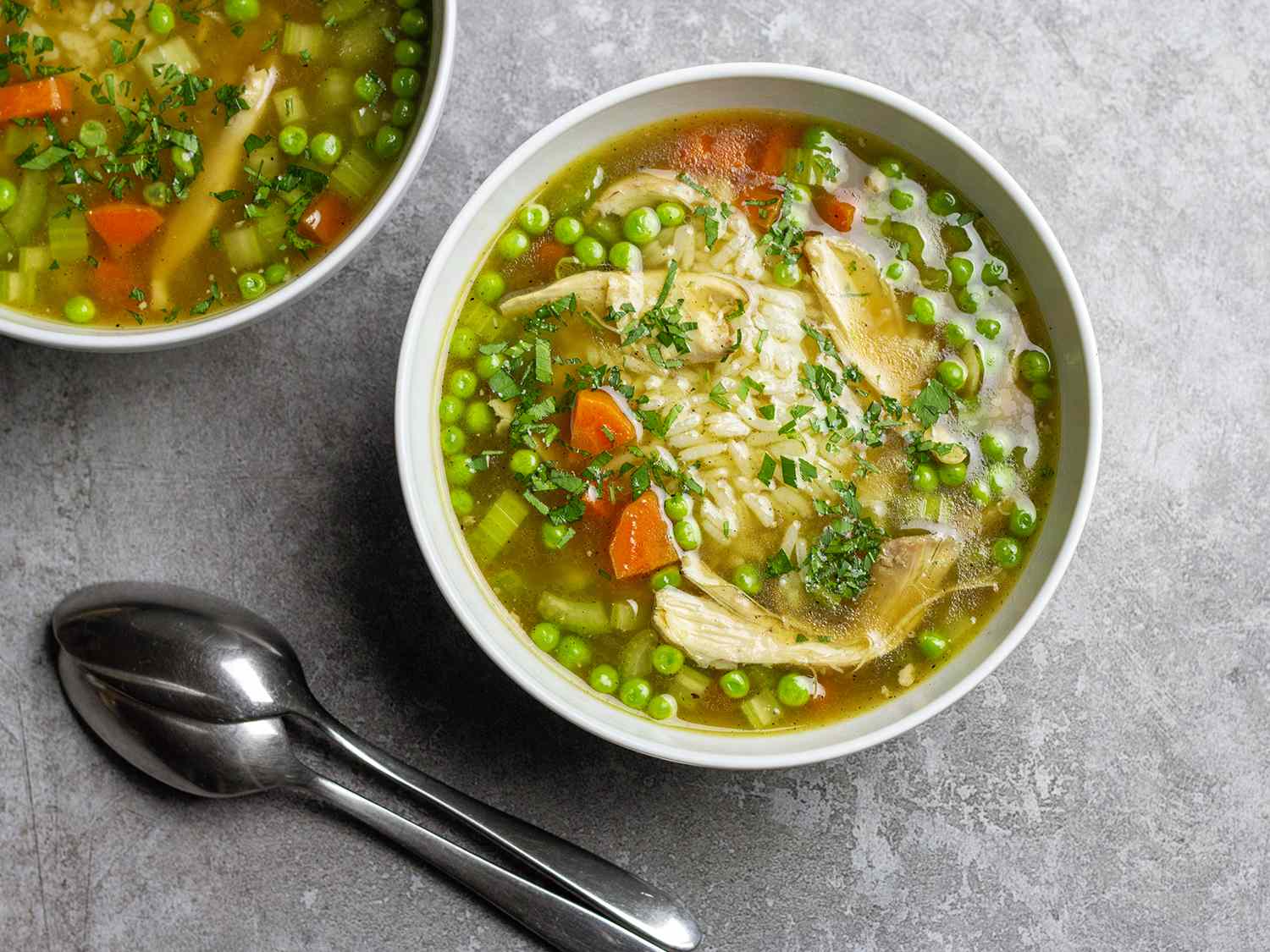 Bijelo meso operite, stavite u šerpu i dodajte 2,5 litra hladne vode. Kuhajte na umjerenoj temperaturi 50-ak minuta. Na polovini kuhanja dodajte očišćen krompir. Kada je meso kuhano, šerpu sklonite s vatre, pa meso i krompir izvadite iz vode i ostavite da se prohlade. Zatim mesu uklonite kožicu i usitnite ga na tračice ili ga rasparčajte prstima, a krompir ispasirajte. Na ugrijanom ulju fino prodinstajte sitno sjeckani crni luk, toliko da omekša, tj. postane kašast i potpuno proziran. Zatim, lagano dodajite (toplu) tečnost u kojoj se kuhala piletina, grašak i začinite prema ukusu, pa nastavite kuhanje dok čorba ne provri. Dodajte pasirani krompir (dobro promiješajte), zatim dodajte meso i nastavite kuhanje još desetak minuta, uz dodatak tople vode po potrebi. Pred kraj kuhanja, čorbu začinite majoranom prema ukusu.
