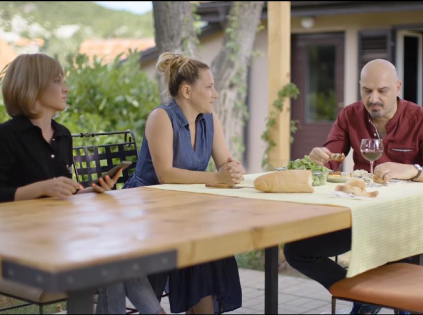 Na snimci vidimo kako jedna crnogorska obitelj ruča za stolom ispred kuće, a baka s vizirom štrika pokraj njih.