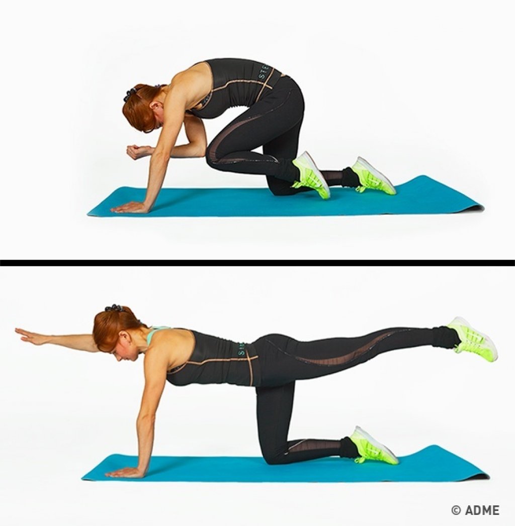 Kako raditi vježbu: Spustite se na ruke i koljena. Ispružite lijevu nogu i desnu ruku formirajuću ravnu liniju, zatim ih polako savijte i dodirnite desnim laktom lijevo koleno. Ponovo se ispravite. Isto to uradite s desnom nogom i lijevom rukom.