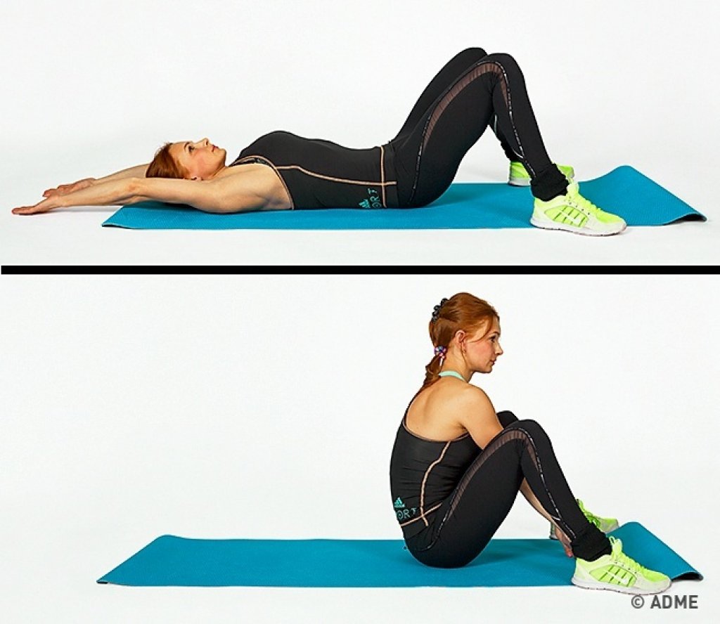 Kako raditi vježbu: Za ovu vježbu potrebno je da legnete na leđa, ispružite ruke iznad glave, noge savijete u koljenima. Zatim s ispruženim rukama polako podignite tijelo i dodirnite stopala. Polako se vratite u prvobitni položaj.