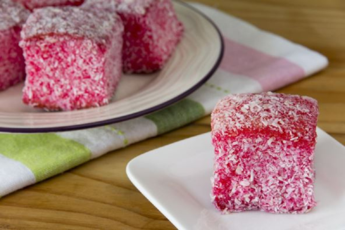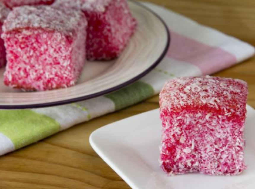 Pomiješajte toplu vodu s bojom za hranu. Biskvit izrežite na kvadrate, pa uzmite jedan kvadrat, premažite ga pekmezom s jedne strane, zatim ga prekrijte drugim kvadratom, opet premažite pekmezom i prekrijte trećim kvadratom. Uvaljati u obojenu vodu, pa u kokos.