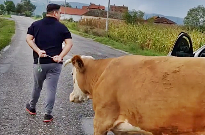 Ipak, kako se očigledno odvikao od života na selu, krava nije bila zadovoljna kako je Darko vodi putem pa je odlučila da ga napadne. Srećom, samo malo. Darko je uspio da joj pobjegne, ali ni ona nije bila prilično uporna u svojoj namjeri.