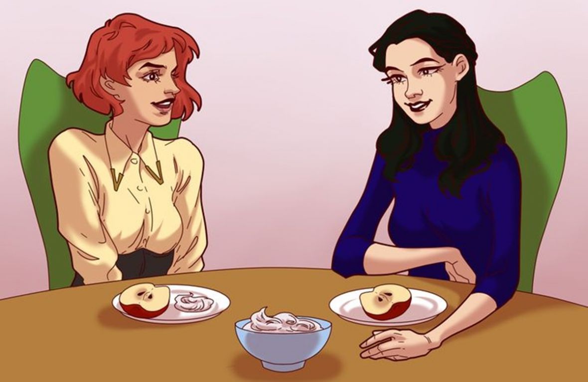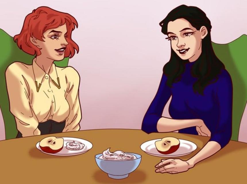 Žena je pozvala jednu prijateljicu kući na večeru. Za večeru je spremila govedinu sa prilogom pire krompirom. Zatim je za desert jabuku prepolovila i ponudila svojoj prijateljici polovinu sa malo šlaga sa strane, a ostatak šlaga je stavila u zasebnu posudu. Zatim je pojela svoj komad iste jabuke.
