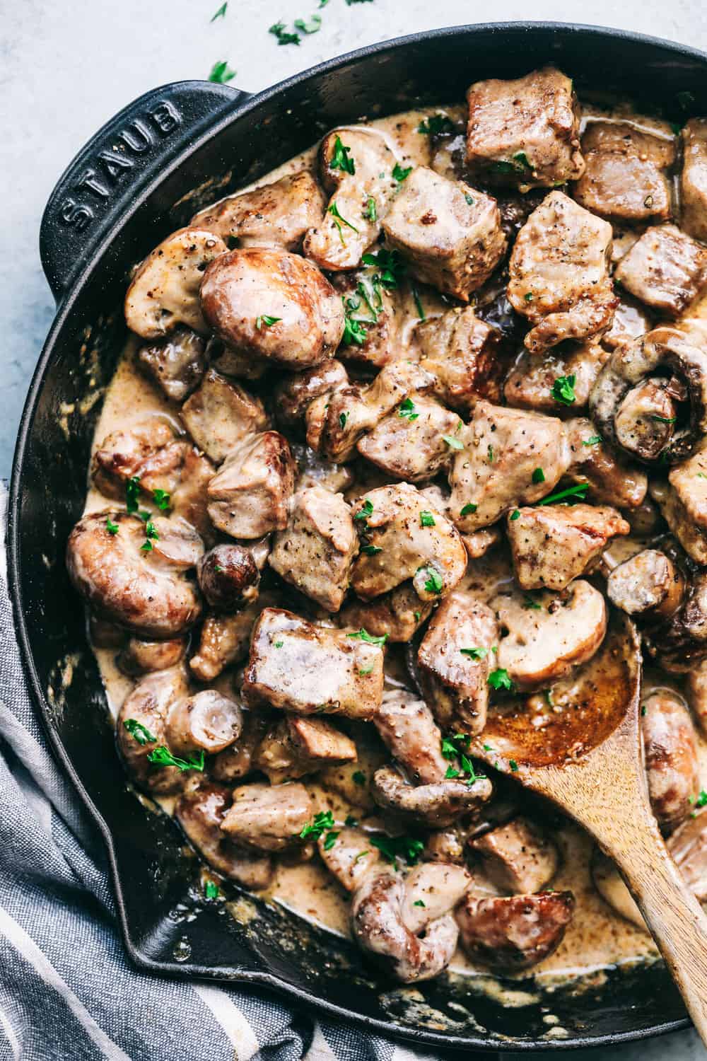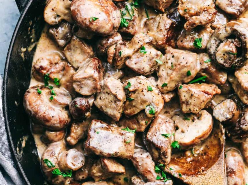 2. Dodajte narezane šampinjone i suhi začin pa nastavite dinstati uz povremeno podlijevanje vodom oko 30 minuta. Kada meso omekša, dodajte škrobno brašno razmućeno u malo vode i vrhnja za kuhanje.