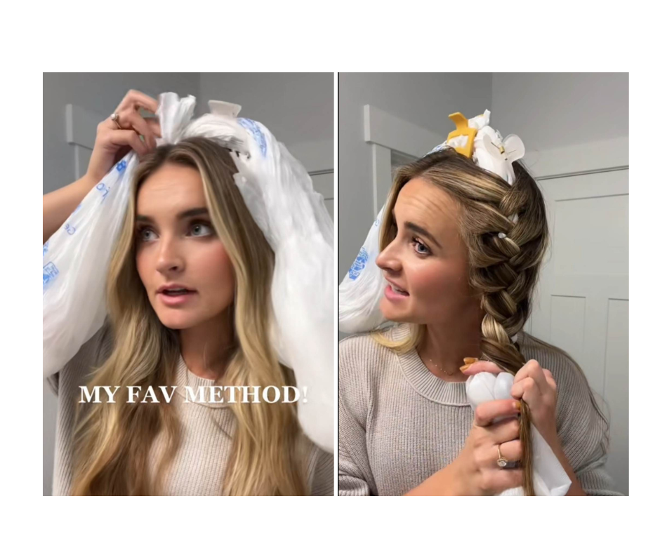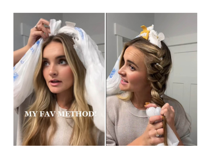 Sve što vam je potrebno da biste napravile ovu frizuru su četiri plastične kese, dvije gumice za kosu i jedna velika šnala.