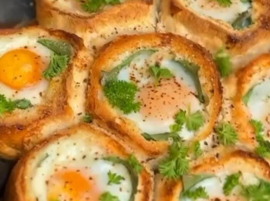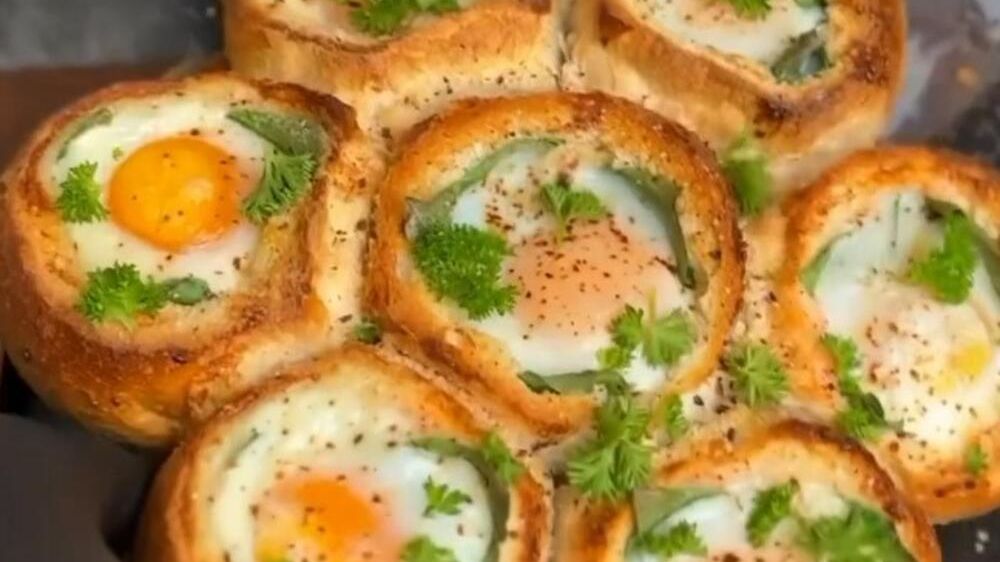 Sastojci: 7 okruglih lepinja, mocarela, ali i bilo koji drugi sir, paradajz, listići špinata ili salate, 7 jaja, so, biber, peršun za serviranje.