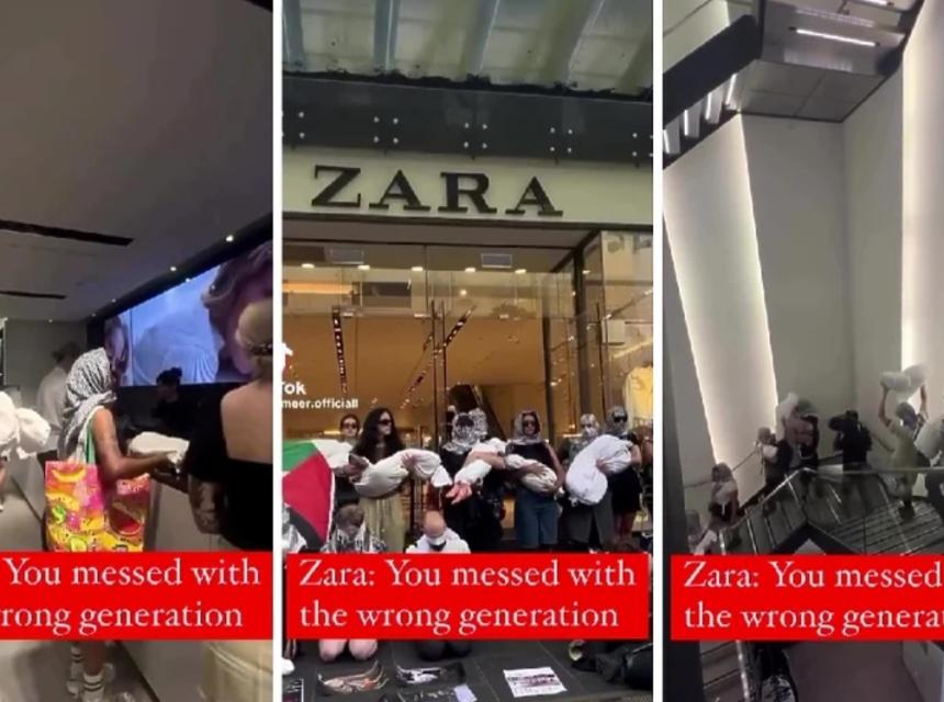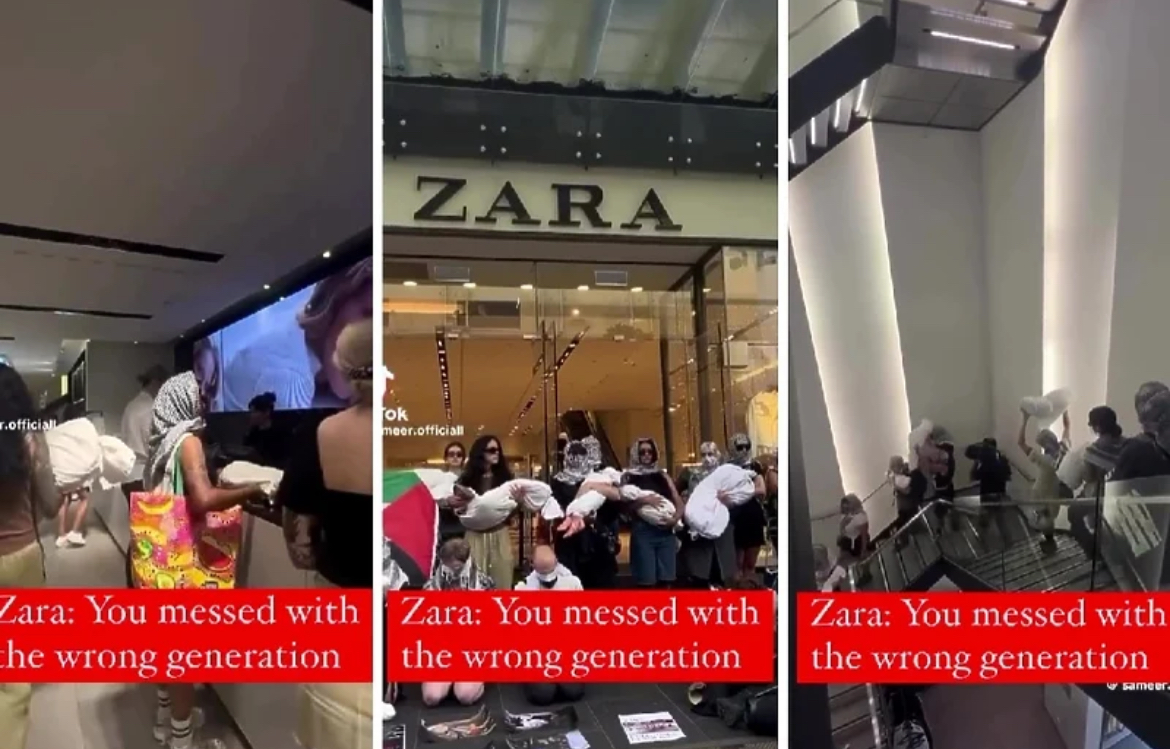 Snimci prikazuju demonstrante kako radnicama na kasama ostavljaju spomenute vreće koje podsjećaju na leševe, a neki su pisali grafite: "slobodna Palestina", a drugi su u znak protesta klečali pred Zarinom trgovinom zavezanih očiju i ruku.