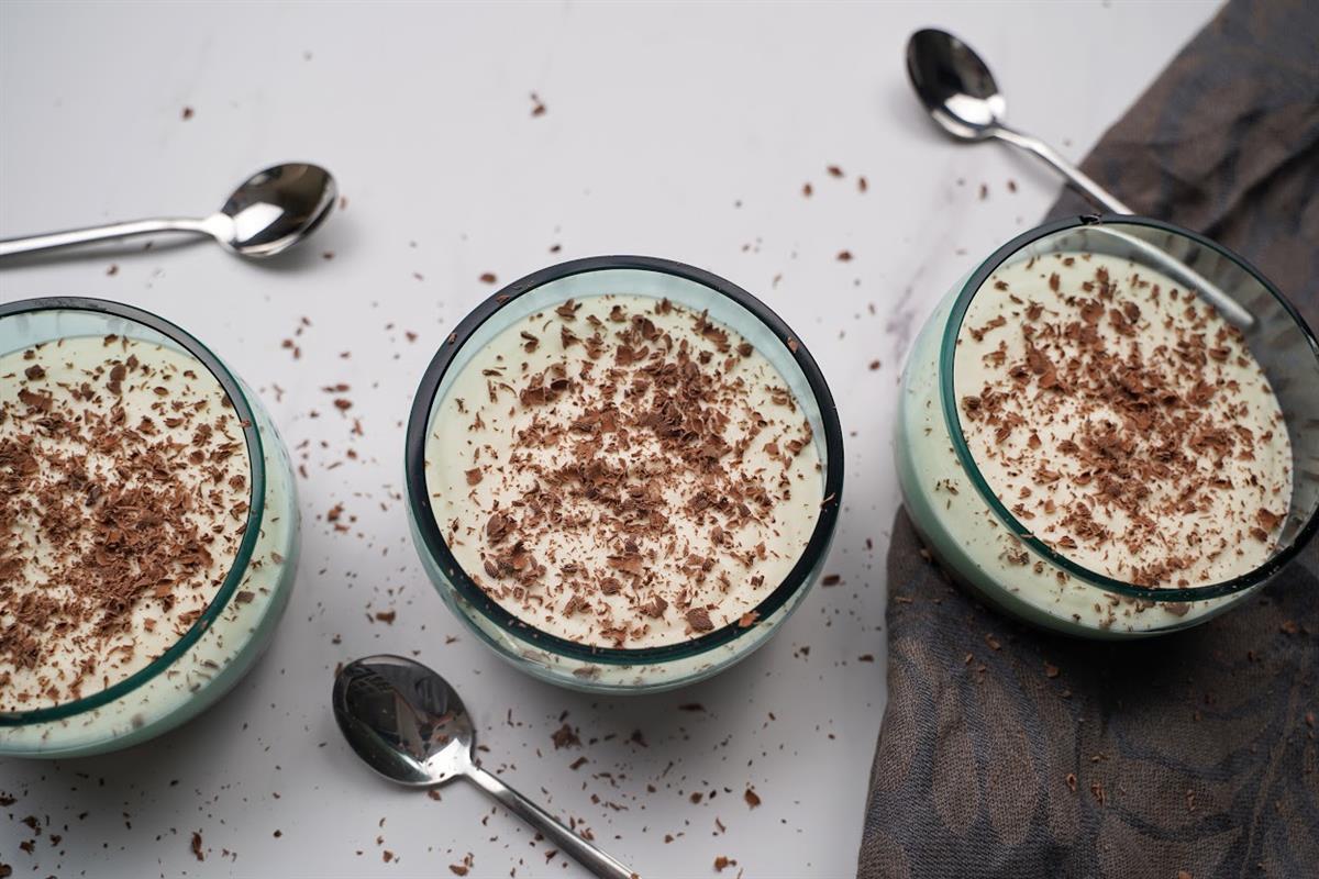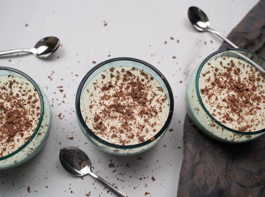 Pripremite manje posudice ili čaše za serviranje. Raspodijelite tamnu smjesu u posudice, zagladite vrh ili malo protresite da se smjesa ravnomjerno rasporedi. Na nju stavite bijelu smjesu i stavite u frižider na 3 do 4 sata.