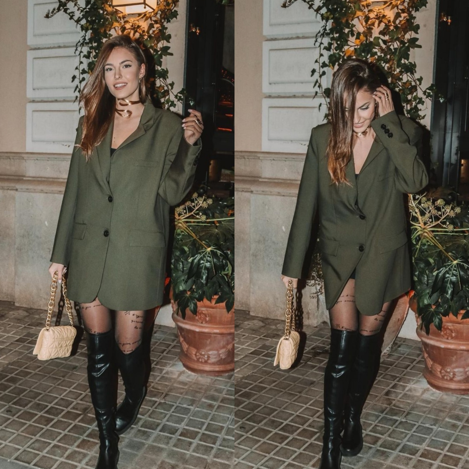 Naime, odjenula je oversized blejzer u maslinastozelenoj boji, čarape s uzorkom i visoke, crne čizme.