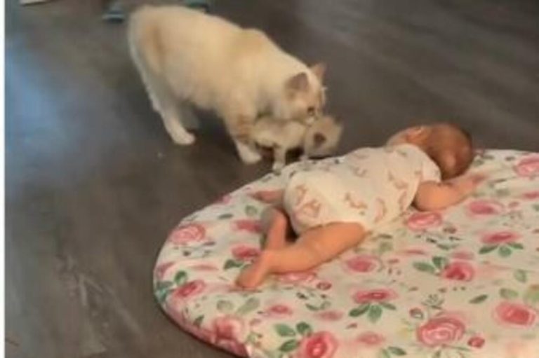 Mačka, očigledno kućni ljubimac te porodice došla je do bebe. U ustima je nosila svoje mladunče i spustila ga pored bebe koja je bezbrižno spavala. Mače je pokušalo da pobjegne ali ga je mama uporno vraćala pored bebe. Ili je životinja željela da pokaže djetetu svoje mladunče ili je procijenila da je mjesto pored bebe najbolje za njeno mladunče. Ovu neobičnu scenu snimila je mama bebe koja je maštovito napravila titl kao da je razgovarala sa svojom ljubimicom.