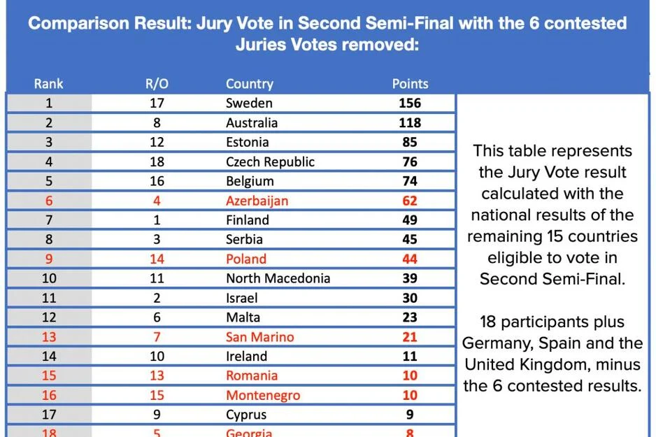 Podsjećamo, EBU je "izbrisala" glasove šest zemalja nakon što je primijetila "nepravilne obrasce glasanja". Umjesto toga, oni su zamijenjeni zbirnim rezultatom zasnovanim na zemljama sa sličnim obrascima glasanja i u drugom polufinalu i u velikom finalu.