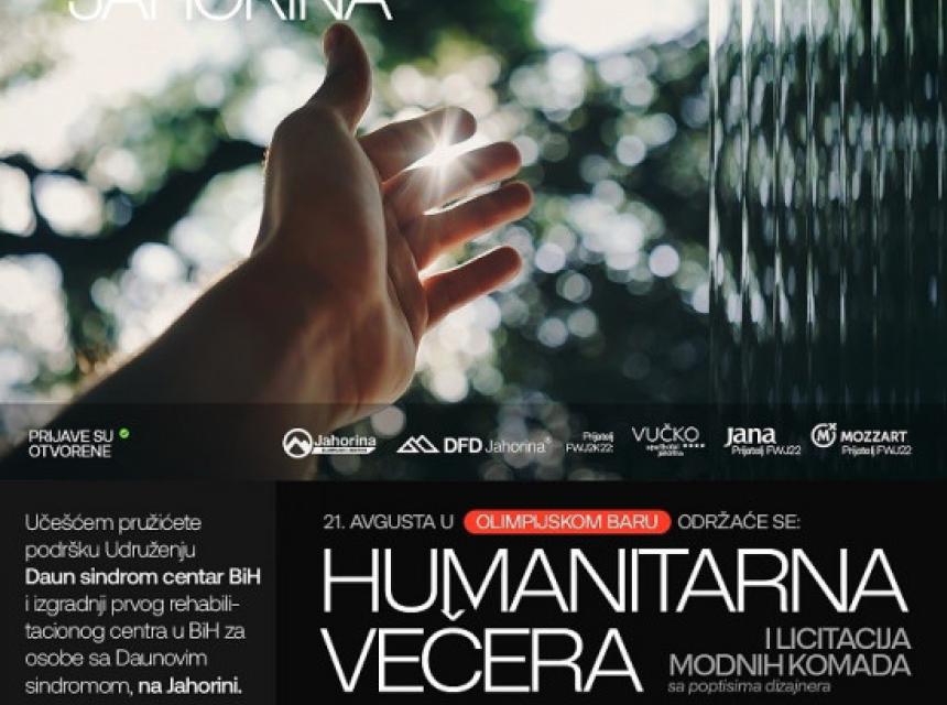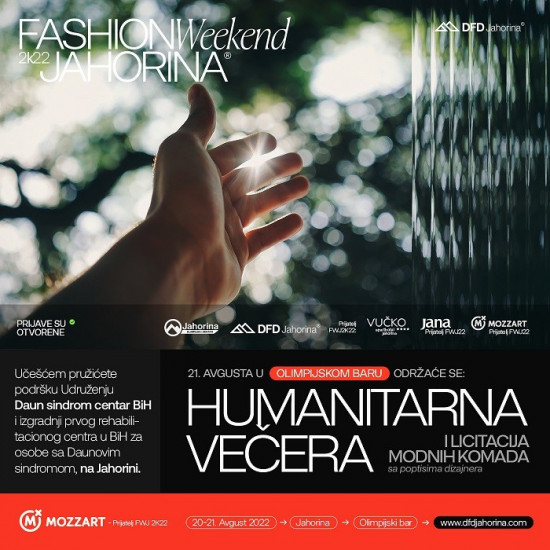 S ciljem pružanja podrške Udruženju Down sindrom centar Banja Luka, koji nastoji u BiH izgraditi prvi rehabilitacioni centar za osobe sa Daunovim sindrom na Jahorini, druge večeri u Olimp baru biće upriličena svečana humanitarna večera i aukcija modnih dodataka dizajnera učesnika FWJ, te oni koji se osjećaju spremno za učiniti dobar korak svoje mjesto za ovaj događaj mogu rezervisati na oficijelnom web sajtu dfdjahorina.com/fashion