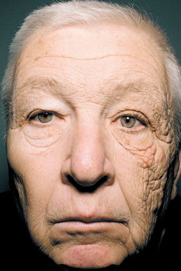Prema studiji, lijeva strana je pokazivala znakove u skladu sa Favre-Racouchot sindromom fotooštećene kože, poznatim kao dermatohelioza.
