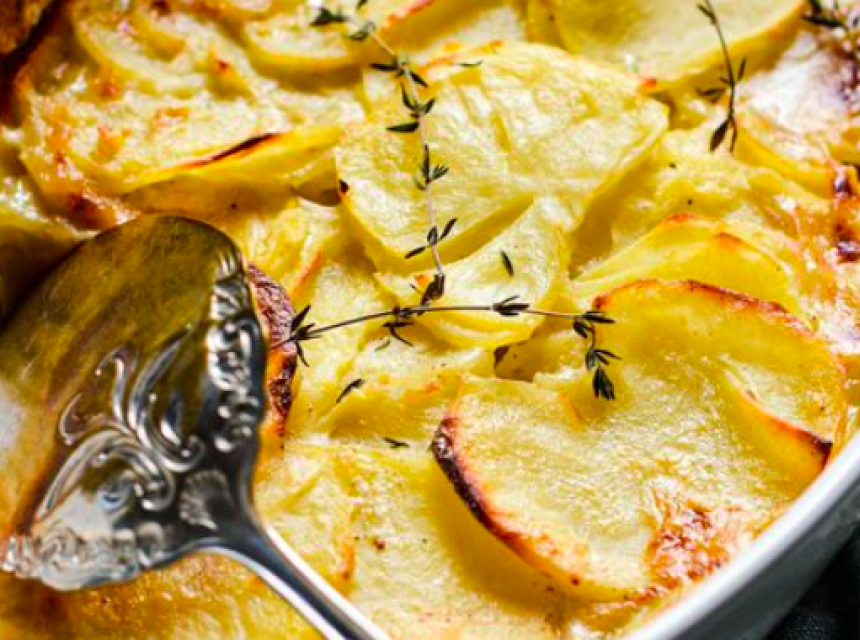 Zagrijte pećnicu na 200°C kako bi se ugrijala dok vi pripremate krompir i smjesu. Premažite maslacem unutrašnjost vatrostalne posude. Neka posuda bude velika otprilike 30 cm x 30 cm i najmanje 6 cm duboka. Mlijeko i vrhnje ulijte u posudu (ili u poseban lončić ukoliko posuda u kojoj planirate peći krompir nije prilagođena vašem štednjaku) te dodajte lovor i češnjak te stavite da kuha. Pustite da zavrije pa lagano kuhajte minutu-dvije. Maknite s vatre i začinite solju i biberom. Dodajte krompir (prethodno oguljen i narezan na tanke ploškice) i veći dio listova timijana i posložite u posudu. Kašikom stavljajte u posudu za gratiniranje i protresite da se sve izjednači. Pospite parmezanom pa prekrijte nauljenom aluminijskom folijom. Pecite 45 do 50 minuta.
