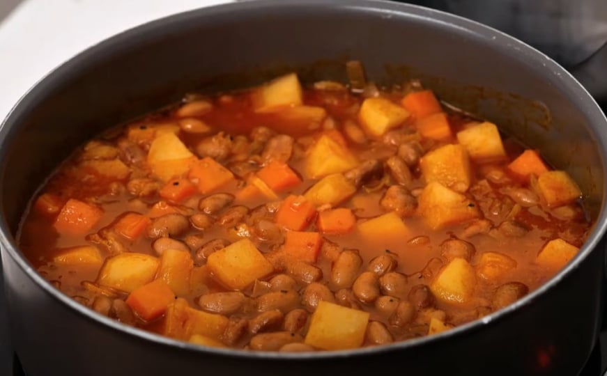 U pitanju je grah dinstan na maslinovom ulju s dodatkom povrća – luka, bijelog luka, mrkvei neobičnog, ali ključnog sastojka – paradajza!