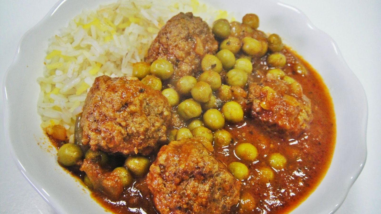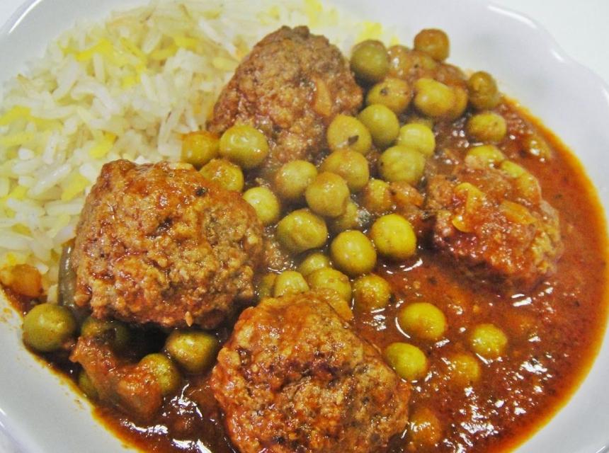 Sastojci: 1 glavica crnog luka, 400 g smrznutog graška, 1/2 šolje paradajz sosa, 600 g mljevenog mesa, 1 kriška hljeba, malo mlijeka, 1 jaje, so, biber, 100 g kačkavalja, malo muškatnog oraščića.