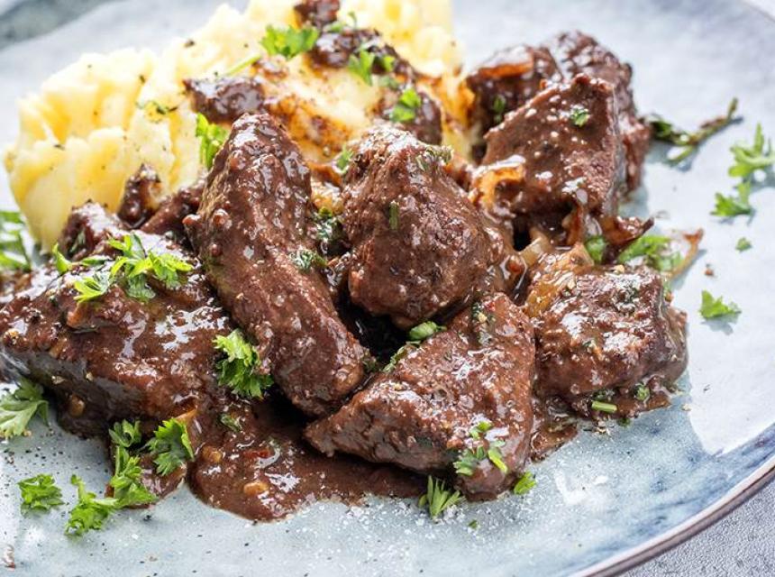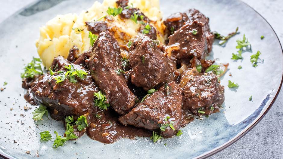 Meso isijecite na komadiće, posolite i pobiberite, pa uvaljajte u brašno. Na ulju otopite pola putera, pa kratko ispržite kockice mesa. Izvadite i ostavite ih na toplom.